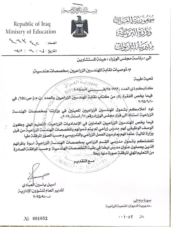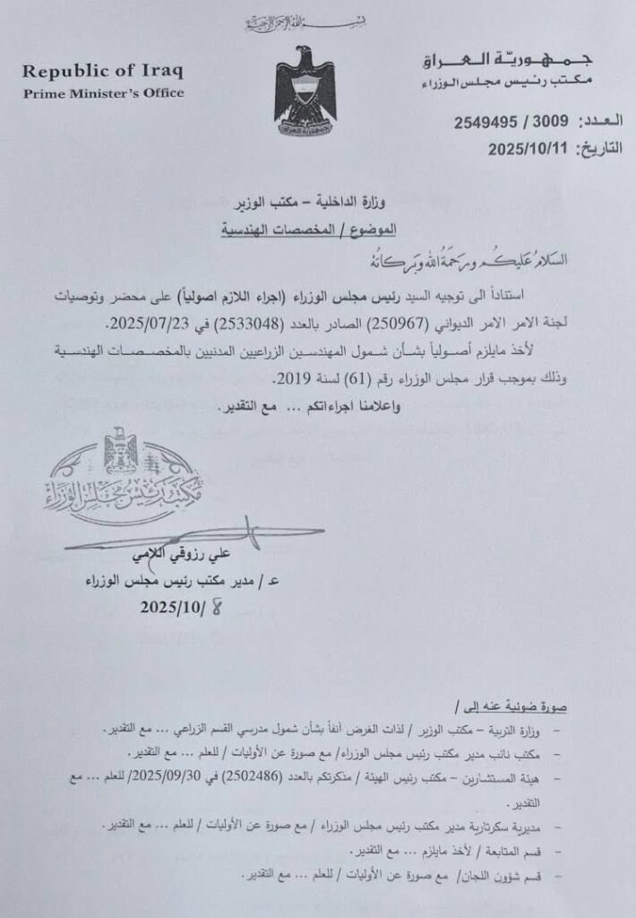 أصدر مكتب رئيس مجلس الوزراء توجيهًا رسميًا إلى وزارة الداخلية ووزارة التربية يقضي بتنفيذ توصيات نقابة المهندسين الزراعيين العراقيين بشأن شمول المهندسين الزراعيين بالتخصصات والمخصصات الهندسية، استنادًا إلى قرار مجلس الوزراء رقم (61) لسنة 2019.